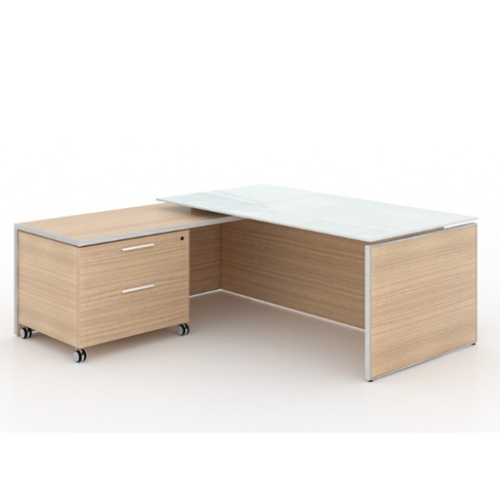 Indulge in a modular, L-shaped desk with ample storage and desk space and a glass modesty panel. Professionals getting through their workdays at home or in a corporate park can benefit from this sizable Desk's three-sided construction. The left and right returns are curved and side-specific. There's plenty of drawer space and open cabinets to store everything you need for productivity, and the sprawling desktop is perfect for people with a lot to juggle. You can place your computer, printer, office supplies, paperwork, mail, and anything else within easy reach. The scratch-resistant, low-glare melamine with various finish options, high-density, thermo-fused laminate, and understated hardware work well in nearly any professional environment.