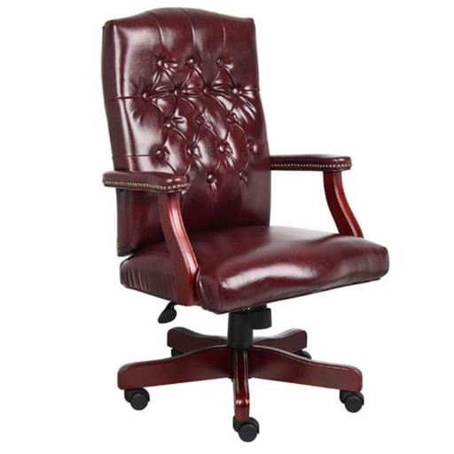 Enhance your conference room or private office’s classic charm with a chair whose design has stood the test of time. Office Furniture Expo is proud of our beautiful furniture selection for professional spaces, and this traditional desk chair with traditional mahogany and driftwood is no exception. The conventional appearance is paired with modern features, such as a spring tilt mechanism for easy tilt tension adjustment, pneumatic lift seat height adjustment, and an upright lock. Some classic furniture traits deserve their place in today’s offices, including the fixed-height padded arms. This chair also glides easily across the floor on its 27-inch base with wheels and hooded brass. You can get this fine furniture piece in black, burgundy, slate grey linen, champagne velvet, black linen, and denim blue linen.
